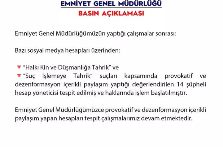 Emniyet Genel Müdürlüğü, provokatif ve dezenformasyon içerikli paylaşımlarda bulunan 14 kuşkulu hesap yöneticisi hakkında...