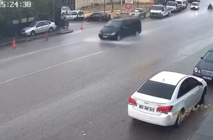 Ankara'da tesirli olan yağmur, yolları kaygan hale getirerek bir motosiklet şoförünün devrilmesine ve sürüklendiği...