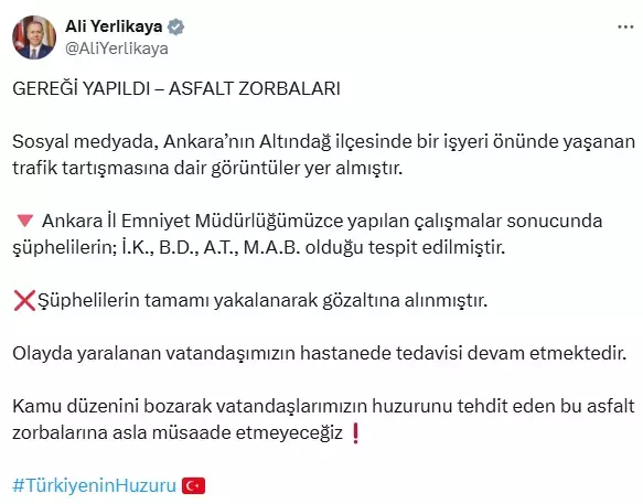 İnfial yaratan manzaraların akabinde harekete geçen Emniyet, olaya karışan şüphelileri kısa müddette gözaltına aldı. Gelişmeyi duyuran İçişleri Bakanı Ali Yerlikaya, “Sosyal medyada, Ankara’nın Altındağ ilçesinde bir işyeri önünde yaşanan trafik tartışmasına dair imajlar yer almıştır.
